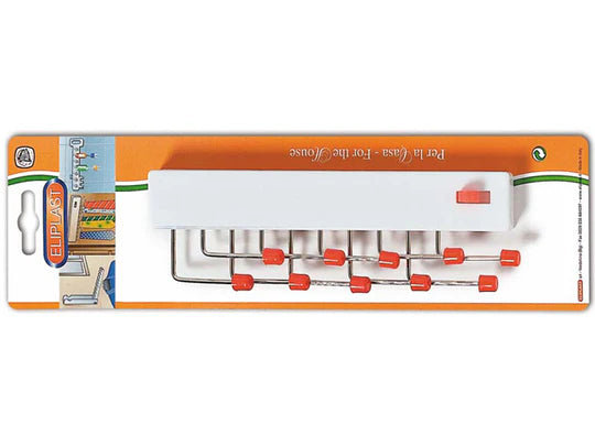 The tie rack of Eliplast is made with strong polystyrene and the hooks are nickel-plated. This item is great to keep in order more and more ties and it can be fixed into wardrobe with a resistant biadhesive included. Revolving hooks. Dimensions: 21x6,5 cm تعليقة كرافات تلتصق على الحائط بلاستيك مع رؤوس معدن تتحرّك